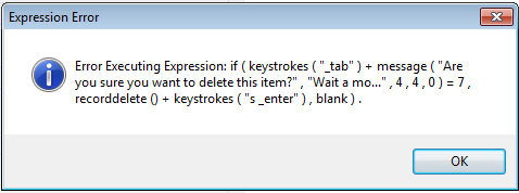 if ( keystrokes ( "_tab" ) + message ( "Are you sure you want to delete this item?" , "Wait a mo..." , 4 , 4 , 0 ) = 7 , recorddelete () + keystrokes ( "s _enter" ) , blank ) )